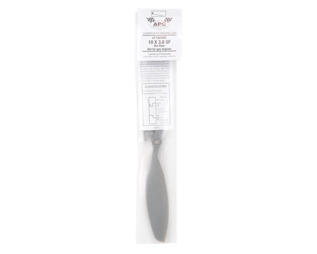 This is an APC 10×3.8 Slow Flyer Pusher Propeller. This prop is for electric use only, do not use with gas applications.