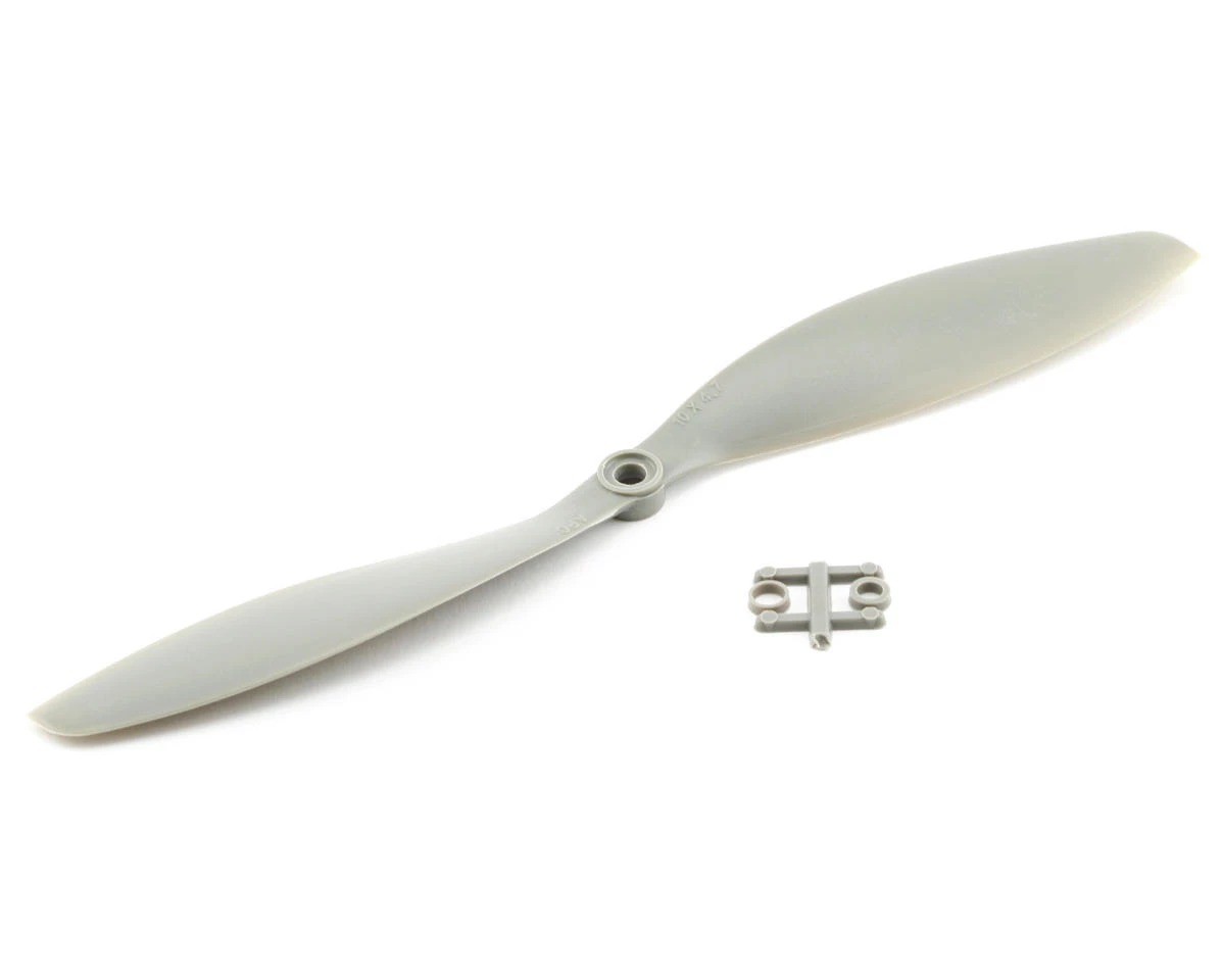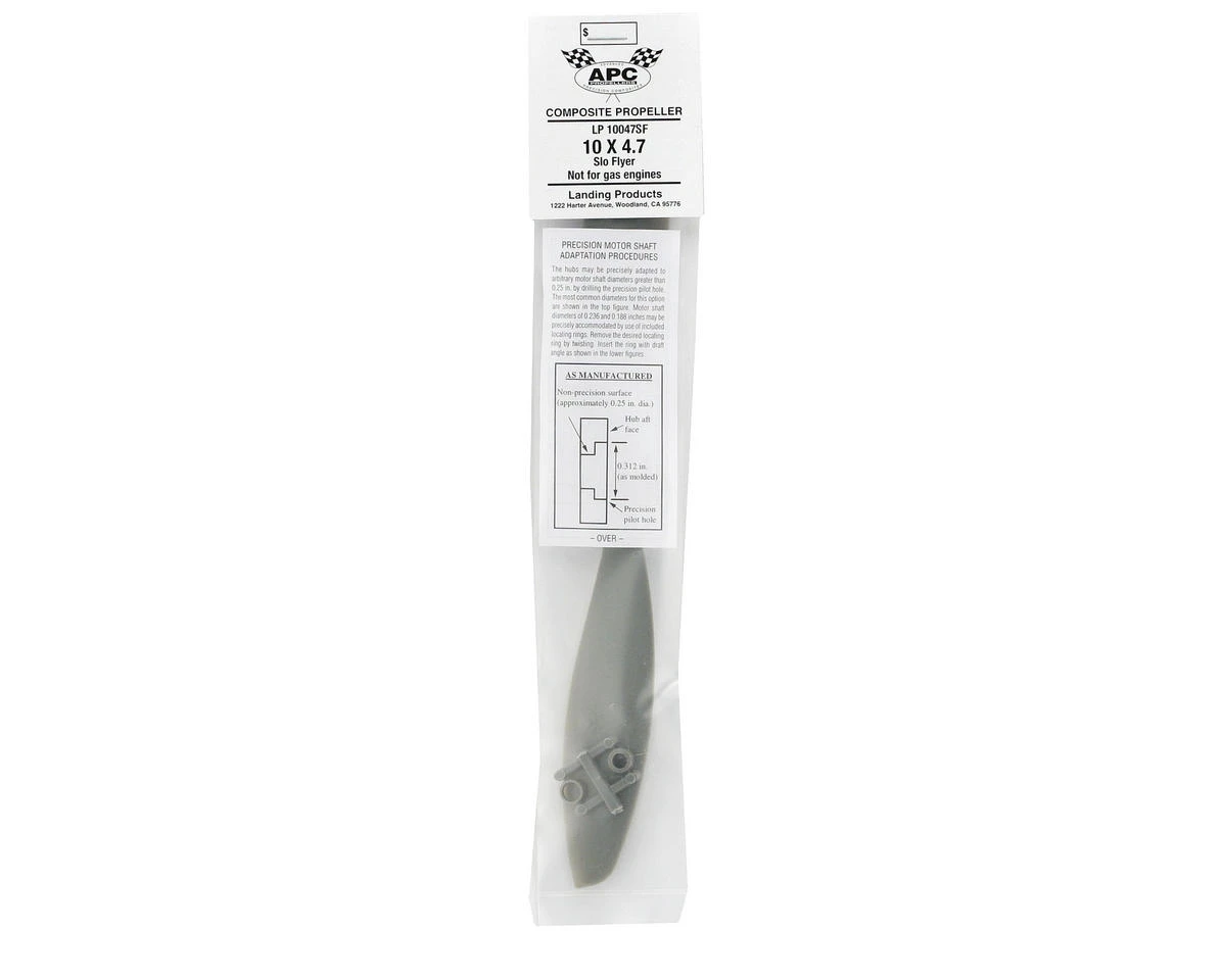 This is the APC 10×4.7 Slo-Flyer Electric Propeller. APC propellers are manufactured using a pultrusion process which allows for a higher fiber (60%) to resin (nylon binder) density. This provides substantially higher strength and stiffness than with glass filled nylon. The additional stiffness is beneficial to control of vibration resonance response. The higher strength allows the use of thinner cross-sections, beneficial to weight and aerodynamic efficiency.