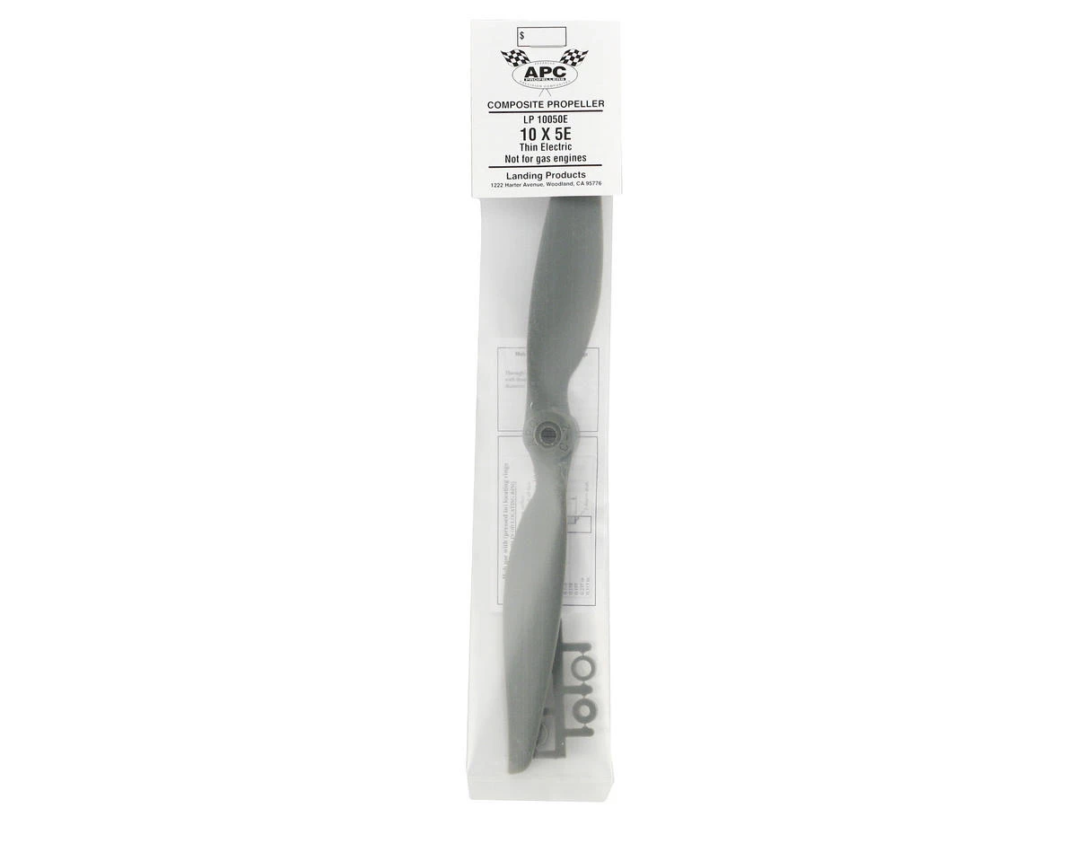 This is the APC 10×5 Thin Electric Propeller. APC propellers aremanufactured using a pultrusion process which allows for a higher fiber(60%) to resin (nylon binder) density. This provides substantiallyhigher strength and stiffness than with glass filled nylon. Theadditional stiffness is beneficial to control of vibration resonanceresponse. The higher strength allows the use of thinner cross-sections,beneficial to weight and aerodynamic efficiency.