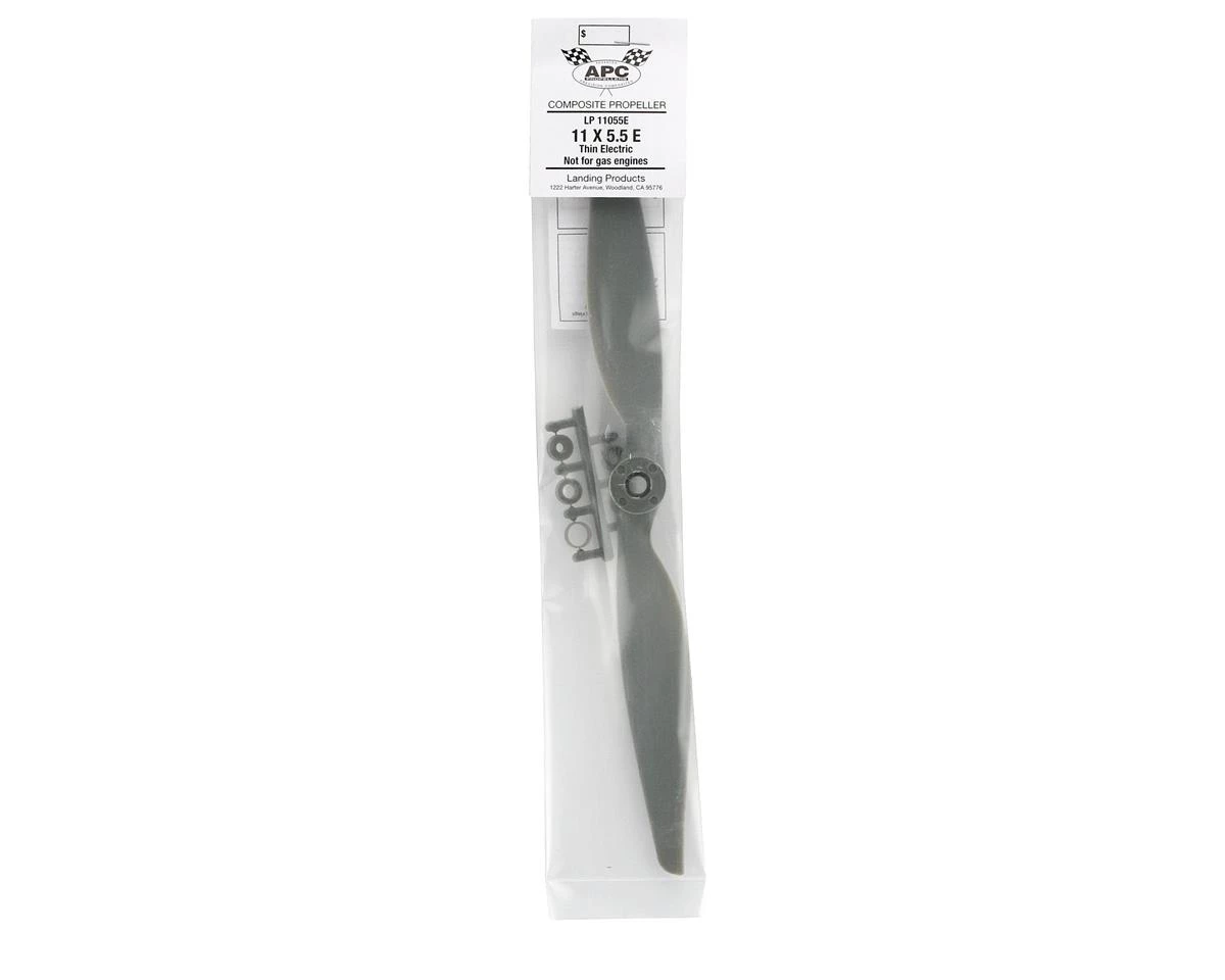 This is the APC 11×5.5 Thin Electric Propeller. APC propellers aremanufactured using a pultrusion process which allows for a higher fiber(60%) to resin (nylon binder) density. This provides substantiallyhigher strength and stiffness than with glass filled nylon. Theadditional stiffness is beneficial to control of vibration resonanceresponse. The higher strength allows the use of thinner cross-sections,beneficial to weight and aerodynamic efficiency.