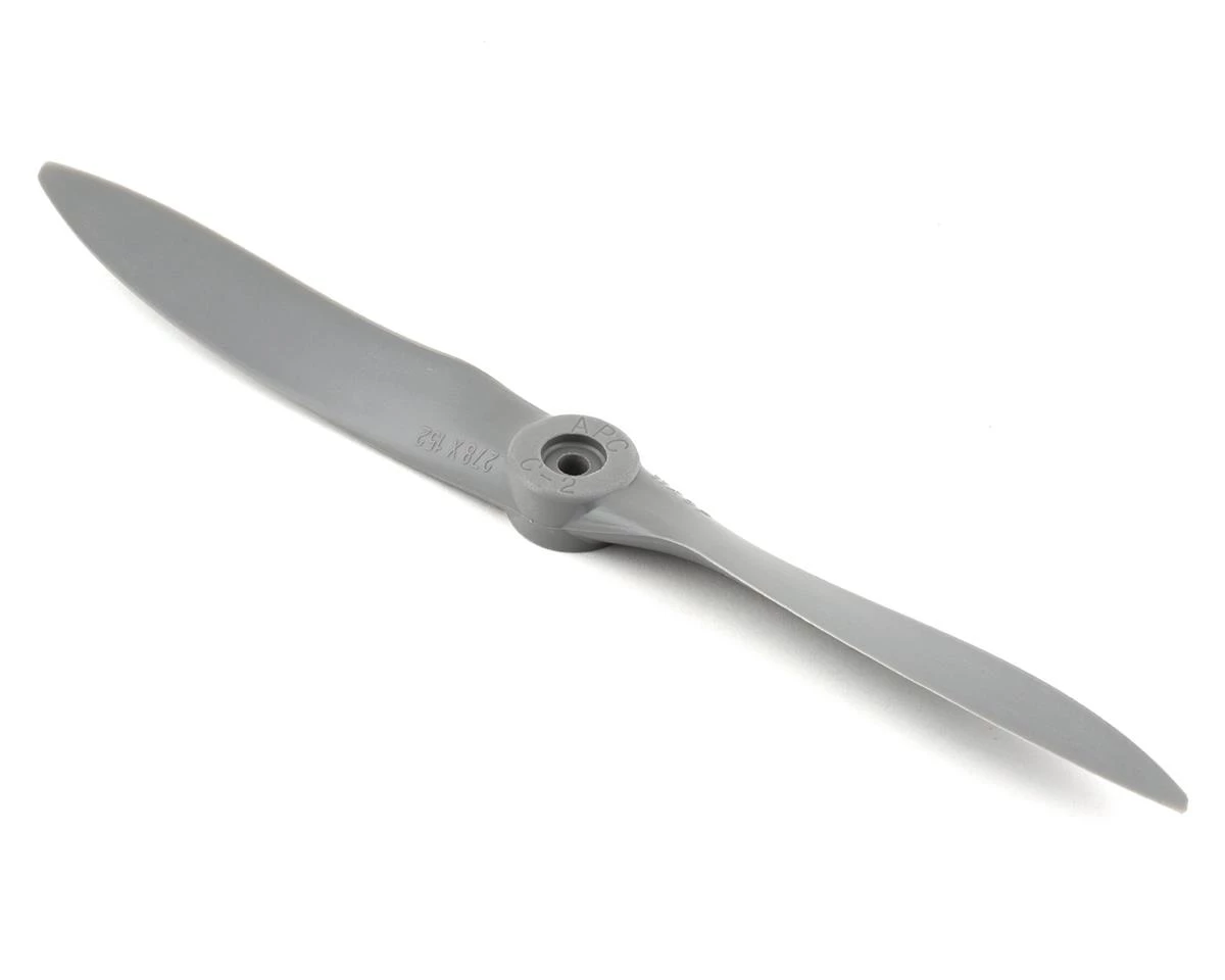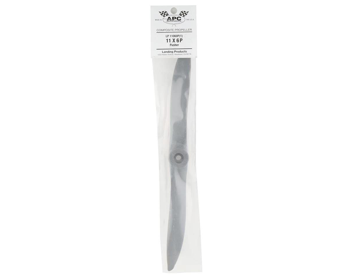 APC 11×6 LP Pusher Propeller. APC propellers are manufactured using a pultrusion process which allows for a higher fiber (60%) to resin (nylon binder) density. This provides substantially higher strength and stiffness than with glass filled nylon. The additional stiffness is beneficial to control of vibration resonance response. The higher strength allows the use of thinner cross-sections, beneficial to weight and aerodynamic efficiency.