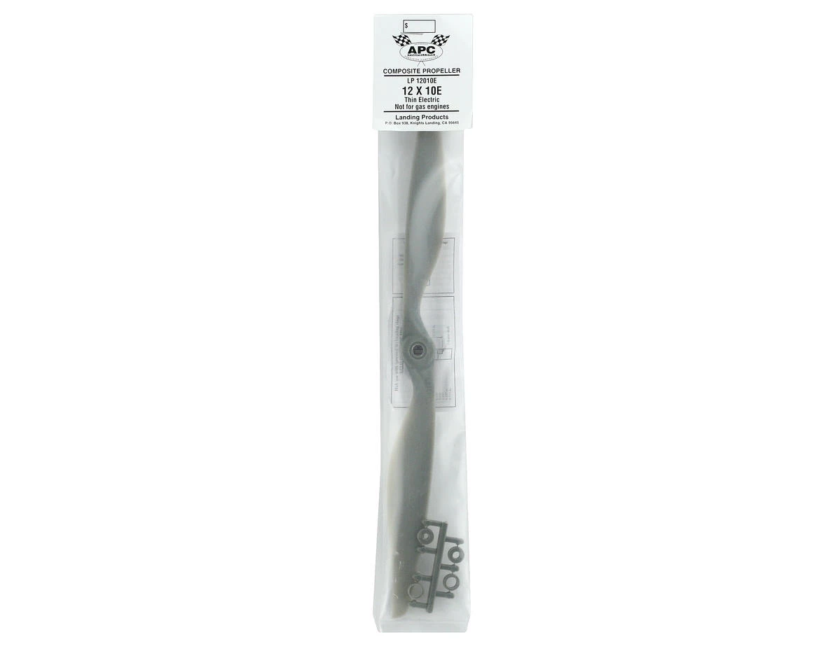 This is the APC 12×10 Thin Electric Propeller. APC propellers aremanufactured using a pultrusion process which allows for a higher fiber(60%) to resin (nylon binder) density. This provides substantiallyhigher strength and stiffness than with glass filled nylon. Theadditional stiffness is beneficial to control of vibration resonanceresponse. The higher strength allows the use of thinner cross-sections,beneficial to weight and aerodynamic efficiency.