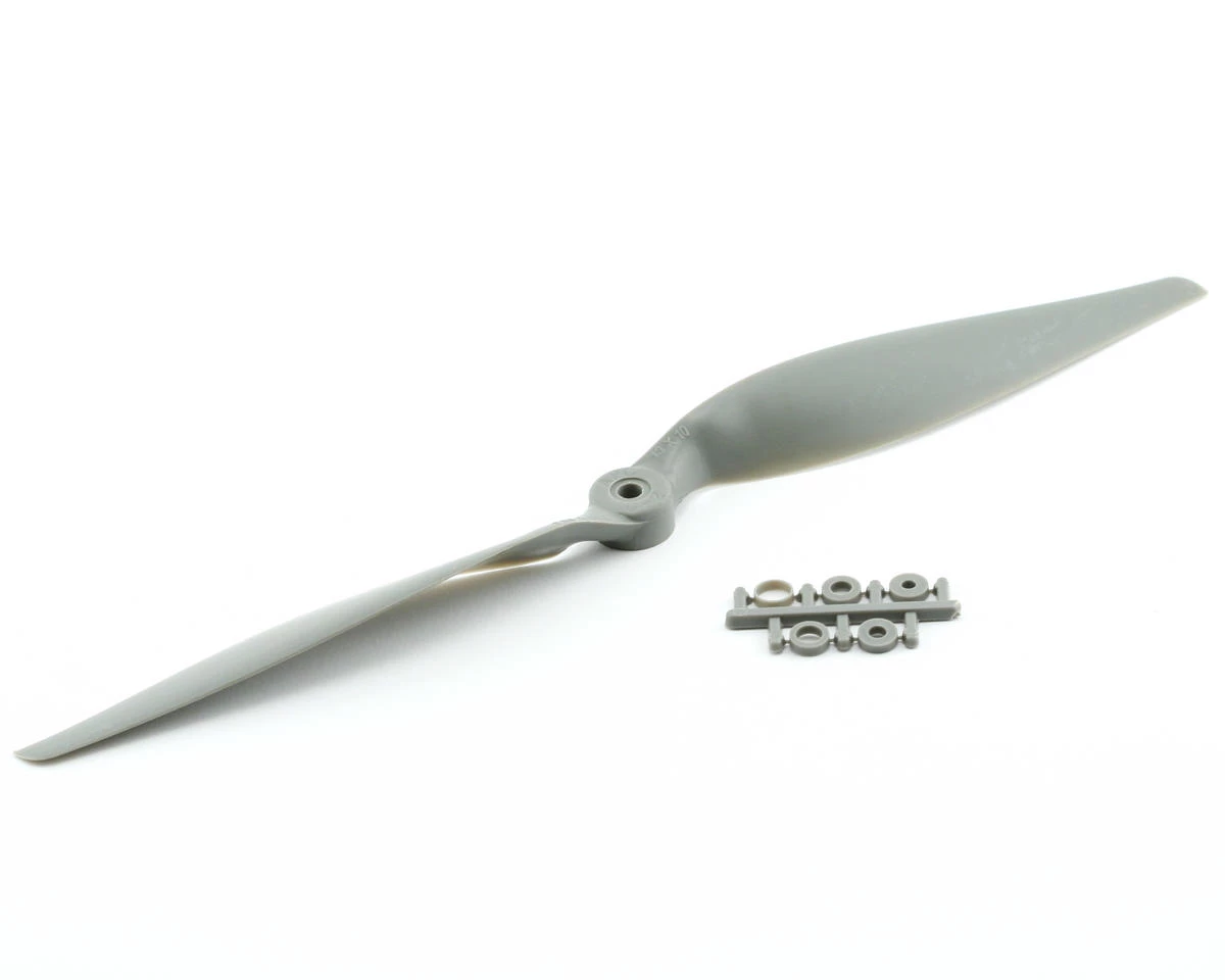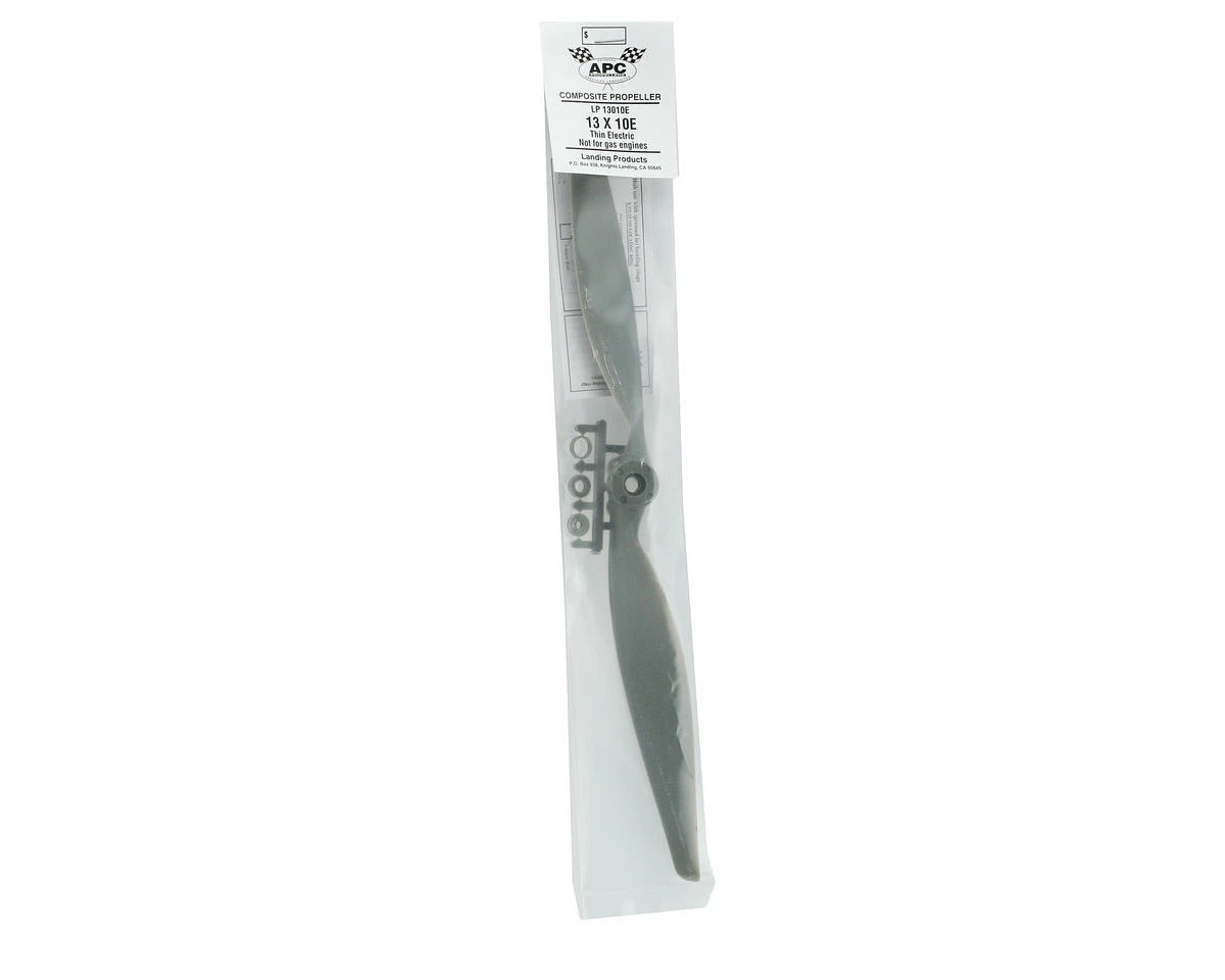 This is the APC 13×10 Thin Electric Propeller. APC propellers aremanufactured using a pultrusion process which allows for a higher fiber(60%) to resin (nylon binder) density. This provides substantiallyhigher strength and stiffness than with glass filled nylon. Theadditional stiffness is beneficial to control of vibration resonanceresponse. The higher strength allows the use of thinner cross-sections,beneficial to weight and aerodynamic efficiency.