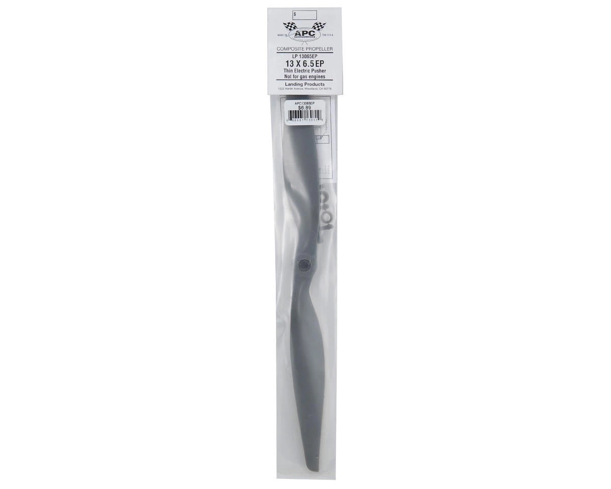This is the APC 13×6.5 Thin Electric Pusher Propeller. APC propellers are manufactured using a pultrusion process which allows for a higher fiber (60%) to resin (nylon binder) density. This provides substantially higher strength and stiffness than with glass filled nylon. The additional stiffness is beneficial to control of vibration resonance response. The higher strength allows the use of thinner cross-sections, beneficial to weight and aerodynamic efficiency.