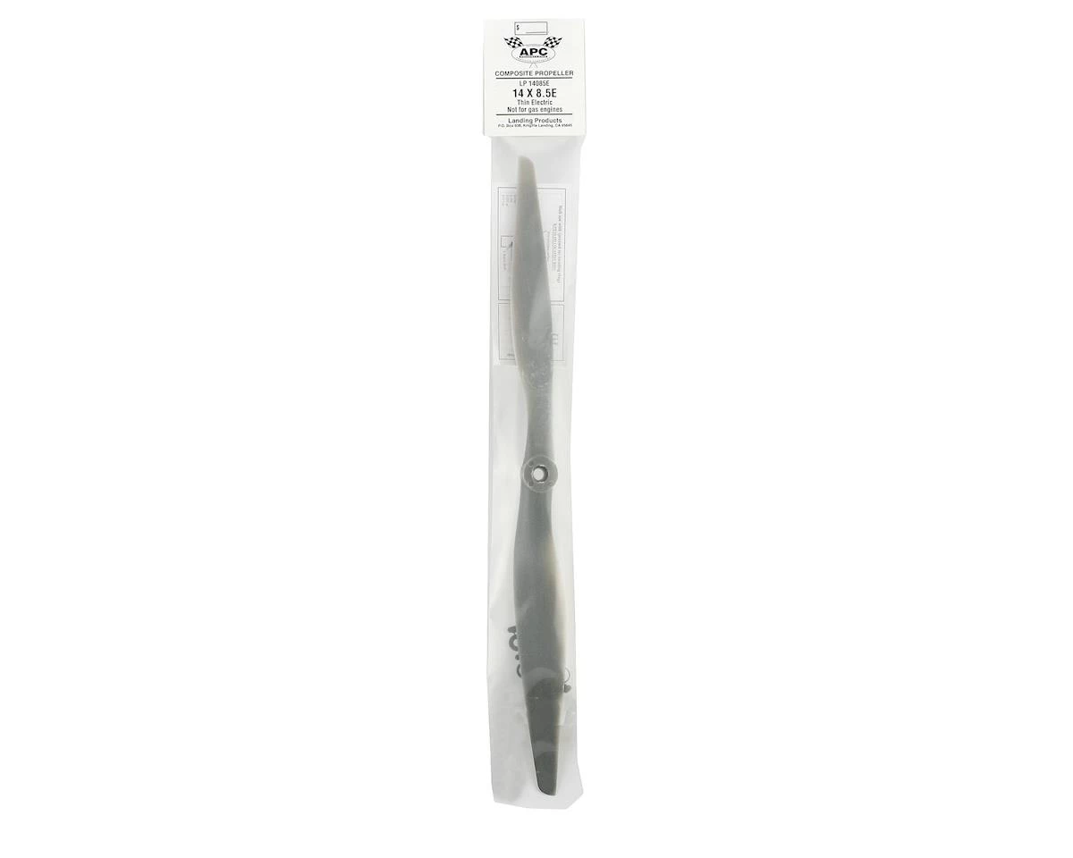 This is the APC 14×8.5 Thin Electric Propeller. APC propellers are manufactured using a pultrusion process which allows for a higher fiber (60%) to resin (nylon binder) density. This provides substantially higher strength and stiffness than with glass filled nylon. The additional stiffness is beneficial to control of vibration resonance response. The higher strength allows the use of thinner cross-sections, beneficial to weight and aerodynamic efficiency.