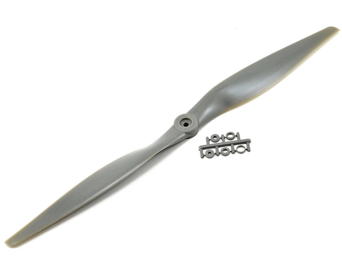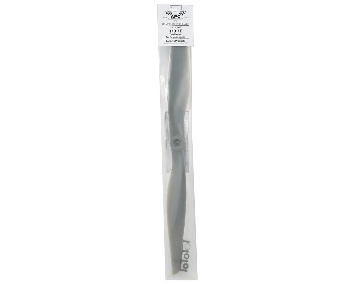 This is an APC 17×7 Thin Electric Propeller. APC propellers are manufactured using a pultrusion process which allows for a higher fiber (60%) to resin (nylon binder) density. This provides substantially higher strength and stiffness than with glass filled nylon. The additional stiffness is beneficial to control of vibration resonance response. The higher strength allows the use of thinner cross-sections, beneficial to weight and aerodynamic efficiency.