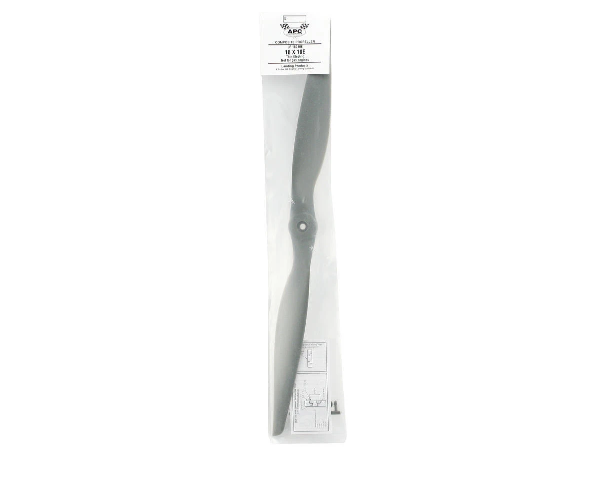 This is the APC 18×10 Thin Electric Propeller. APC propellers are manufactured using a pultrusion process which allows for a higher fiber (60%) to resin (nylon binder) density. This provides substantially higher strength and stiffness than with glass filled nylon. The additional stiffness is beneficial to control of vibration resonance response. The higher strength allows the use of thinner cross-sections, beneficial to weight and aerodynamic efficiency.