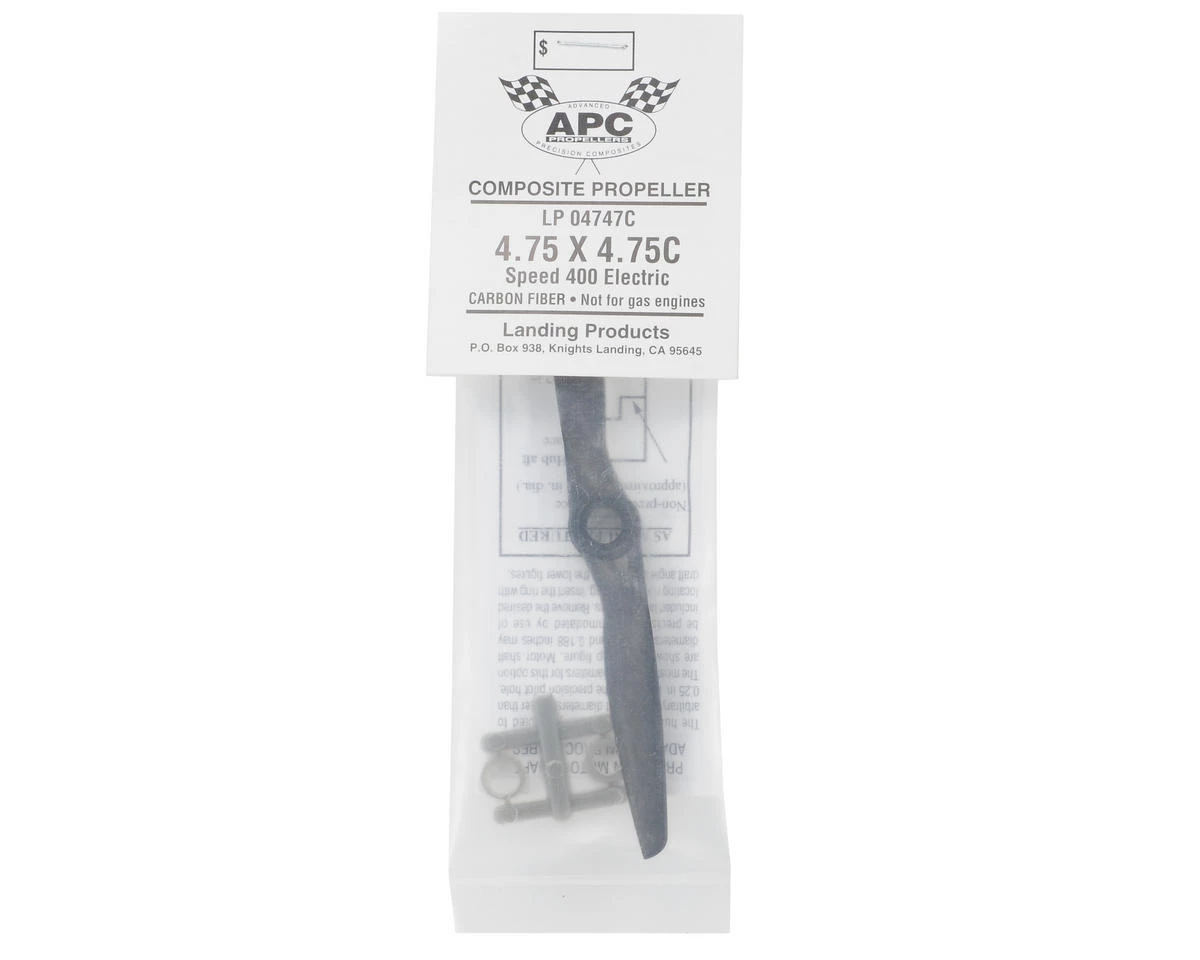 This is an APC 4.75 X 7.5C “tractor” (not a “pusher”) airplane propeller. This prop is designed for the speed 400 size motors.