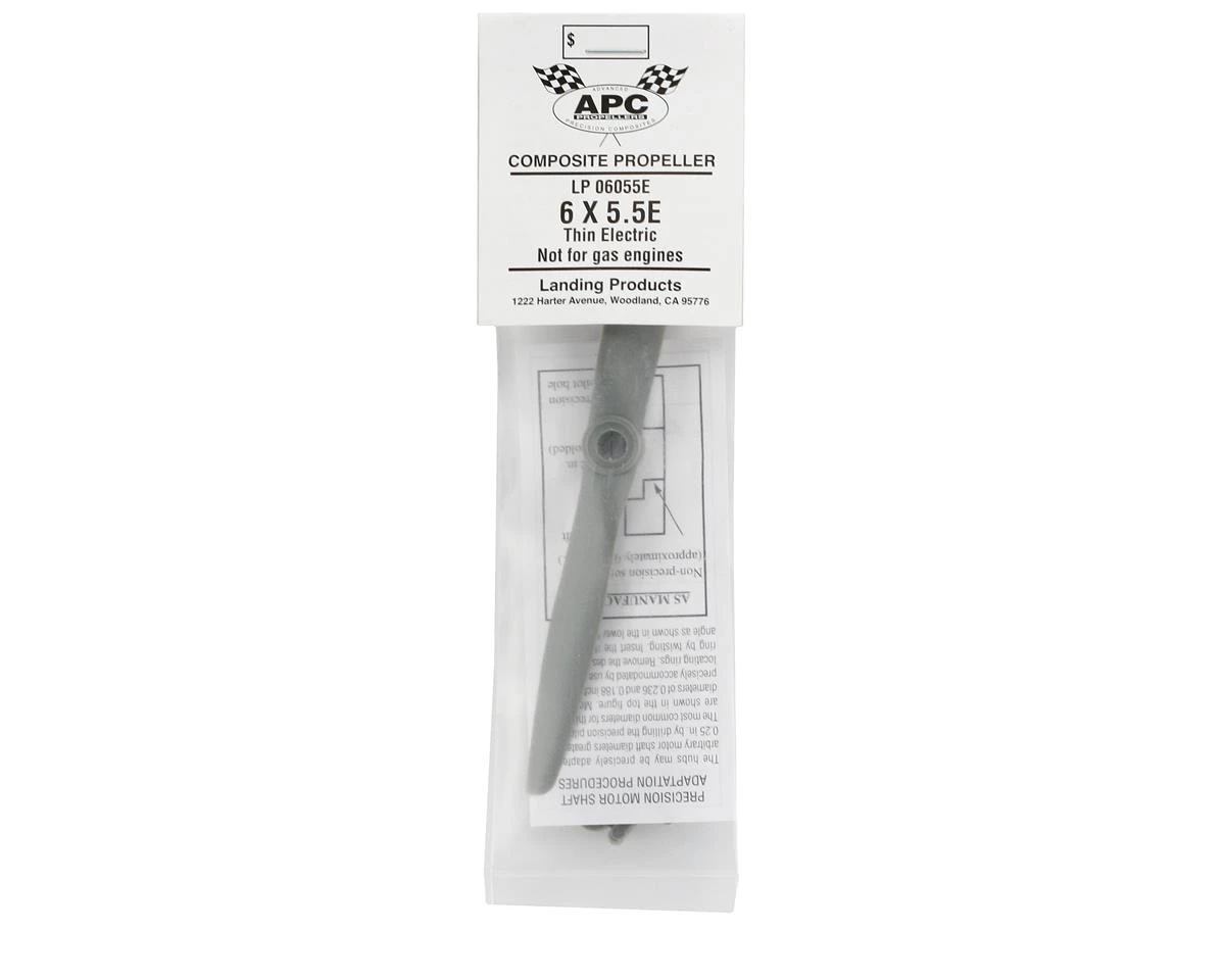 This is the APC 6×5.5 Thin Electric Propeller. APC propellers aremanufactured using a pultrusion process which allows for a higher fiber(60%) to resin (nylon binder) density. This provides substantiallyhigher strength and stiffness than with glass filled nylon. Theadditional stiffness is beneficial to control of vibration resonanceresponse. The higher strength allows the use of thinner cross-sections,beneficial to weight and aerodynamic efficiency.