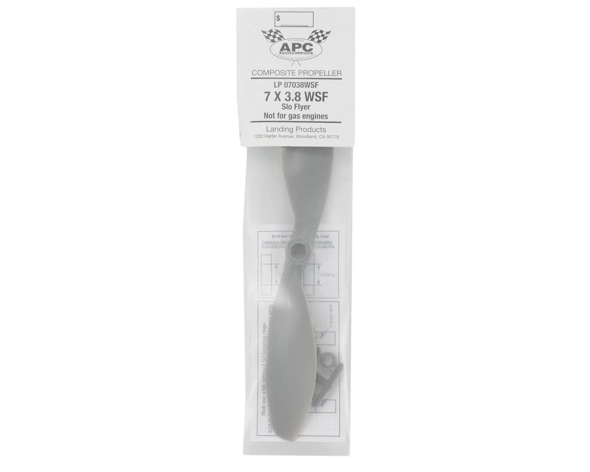 This is an APC 7×3.8 Slow Flyer Propeller. This prop is not for use with gas engines, it is intended for use with electric motors only.