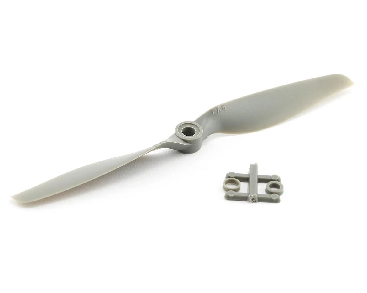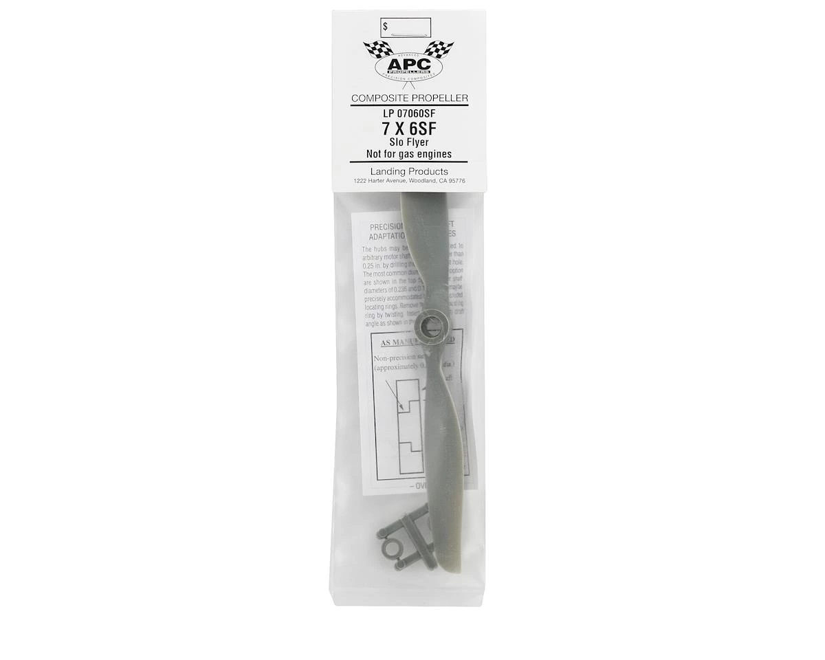 This is the APC 7×6 Slo-Flyer Electric Propeller. APC propellers are manufactured using a pultrusion process which allows for a higher fiber (60%) to resin (nylon binder) density. This provides substantially higher strength and stiffness than with glass filled nylon. The additional stiffness is beneficial to control of vibration resonance response. The higher strength allows the use of thinner cross-sections, beneficial to weight and aerodynamic efficiency.