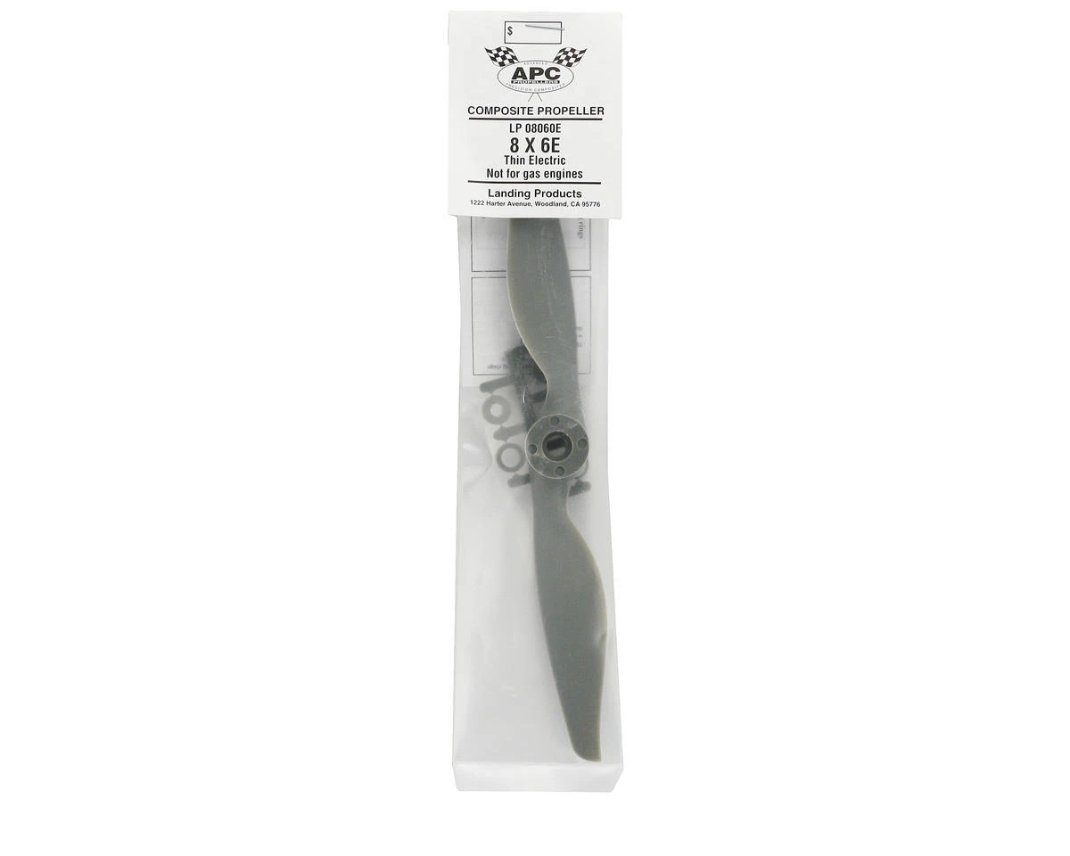 This is the APC 8×6 Thin Electric Propeller. APC propellers aremanufactured using a pultrusion process which allows for a higher fiber(60%) to resin (nylon binder) density. This provides substantiallyhigher strength and stiffness than with glass filled nylon. Theadditional stiffness is beneficial to control of vibration resonanceresponse. The higher strength allows the use of thinner cross-sections,beneficial to weight and aerodynamic efficiency.