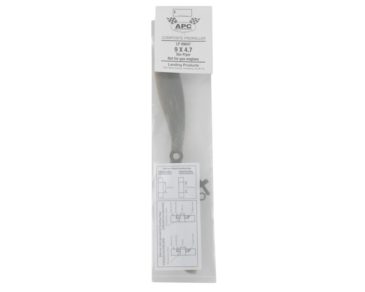 This is the APC 9×4.7 Slow Flyer Propeller. This slow flyer prop is not for use with gas engines, only electric motors.Â
