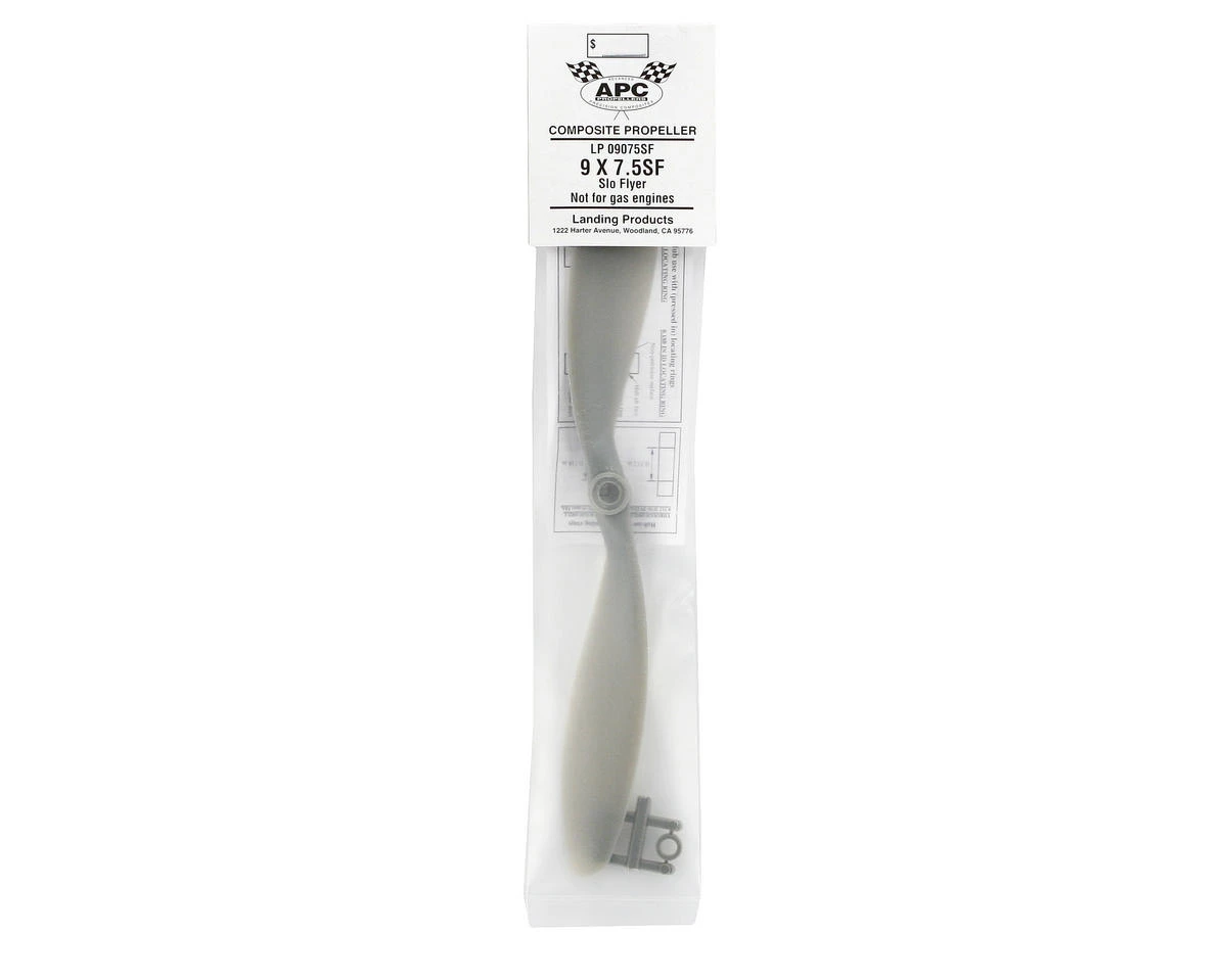 This is the APC 9×7.5 Slo-Flyer Electric Propeller. APC propellers aremanufactured using a pultrusion process which allows for a higher fiber(60%) to resin (nylon binder) density. This provides substantiallyhigher strength and stiffness than with glass filled nylon. Theadditional stiffness is beneficial to control of vibration resonanceresponse. The higher strength allows the use of thinner cross-sections,beneficial to weight and aerodynamic efficiency.