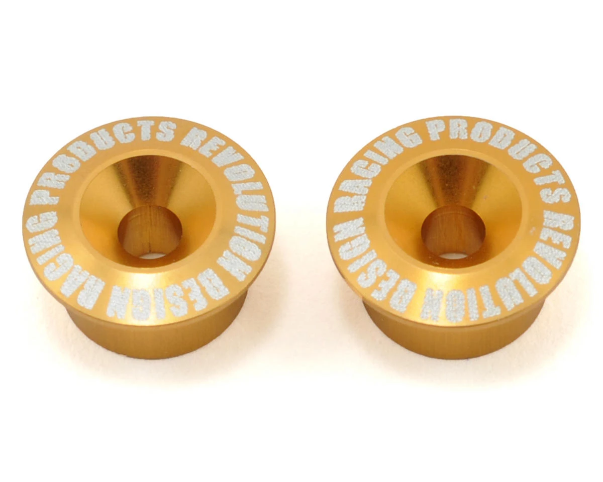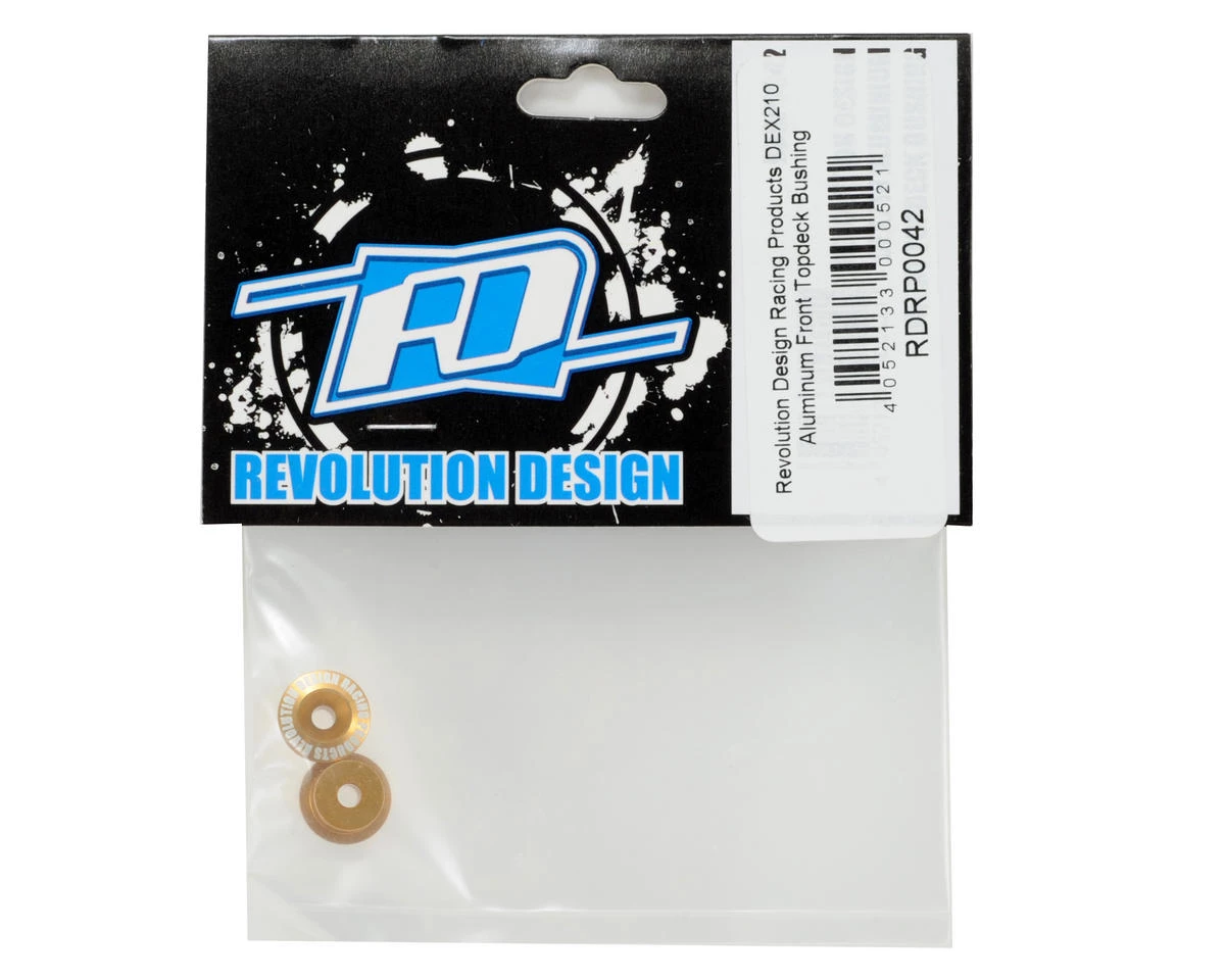 This is an optional Revolution Design Racing Products Aluminum Front Top Deck Bushing Set, and is intended for use with the Team Durango DEX210, DEST210 & DESC210 1/10 scale vehicles. The RDRP Front Top Deck Bushing is designed to replace the stock plastic insert with a great looking solution that adds a cool factory touch to your Durango ride. CNC-machined from 7075-T6 aluminum, with a durable gold anodized finish and cool looking Revolution Design Racing Products engraving, there is no doubt that this is a genuine RDRP part.