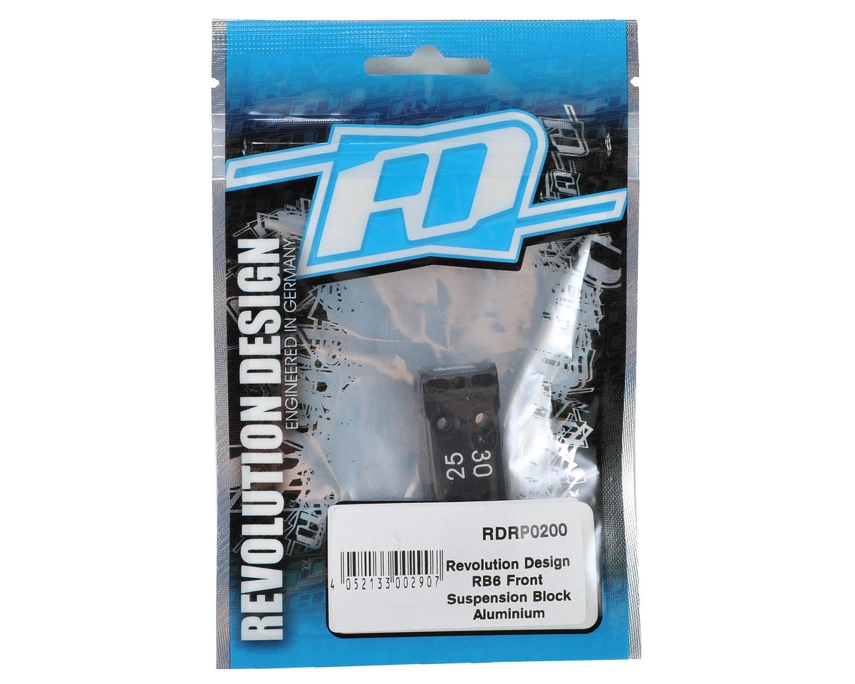 This is the optional Revolution Design Racing Products Aluminum RB6 Front Suspension Block. This front suspension block is designed to replace the kit’s plastic bulkhead with a more durable, precision machined aluminum component that weighs only 7 grams. Manufactured from 7075-T6 aluminum and black anodized for a stealthy look, this drop fit upgrade allows the user to choose between 25° and 30° A-arm kick-up to tune the car’s front end grip by simply rotating the bulkhead 180°. Plus, the alloy material greatly improve the durability of the front end and adds much needed rigidity without adding weight.