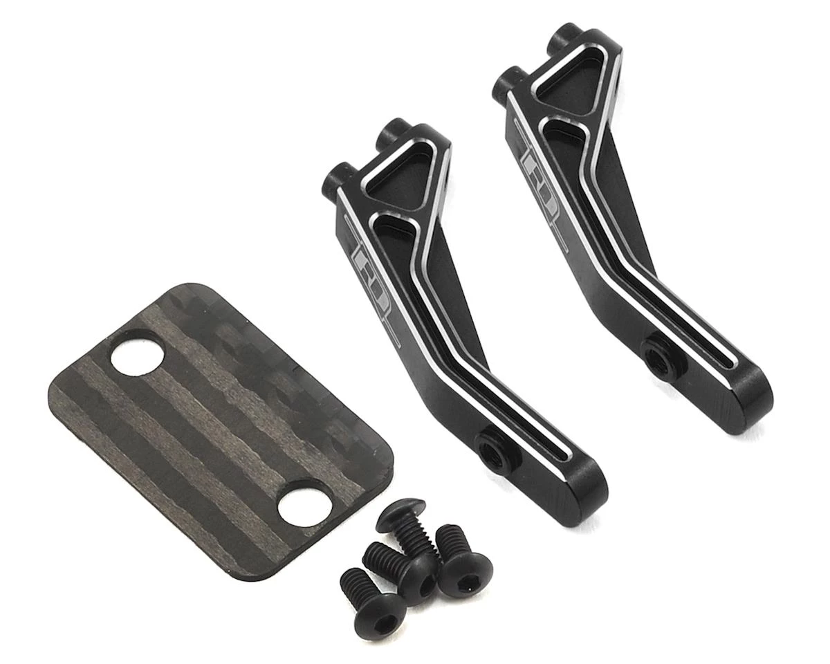The RDRP B6 Aluminum Wing Mount Set is a direct fit on the Team Associated B6 and B6D buggies. The wing mounts are machined from high-quality 7075-T6 aluminum for improved rigidity and durability while the anodized surface and silver edge details make for an ultra-cool look. A connecting carbon fiber plate was machined at an angle, allowing to adjust the rear wing angle in order to further fine-tune aerodynamic down force. Additionally, the large surface carbon plate lets the wing rest on a more sturdy base than common wing mounts, prolonging the wing’s life while also optimizing overall downforce. The wing mounts are available in black or blue anodizing.