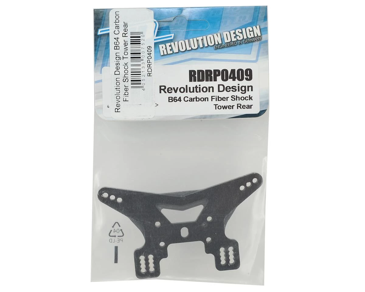 The RDRP B64 Carbon Fiber Rear Shock Tower is a direct fit on the Team Associated B64 kits. It utilizes the standard kit geometry but sports an updated design for improved looks and greater durability, making it especially useful on those demanding dirt and astro turf tracks. On top of this allows an additional lower row of rear camber link mounting holes for an optimized rear roll center which can be beneficial in a variety of track conditions. The rear shock stay is cut from high-quality carbon fiber and it fits both the B64 and B64D buggies.