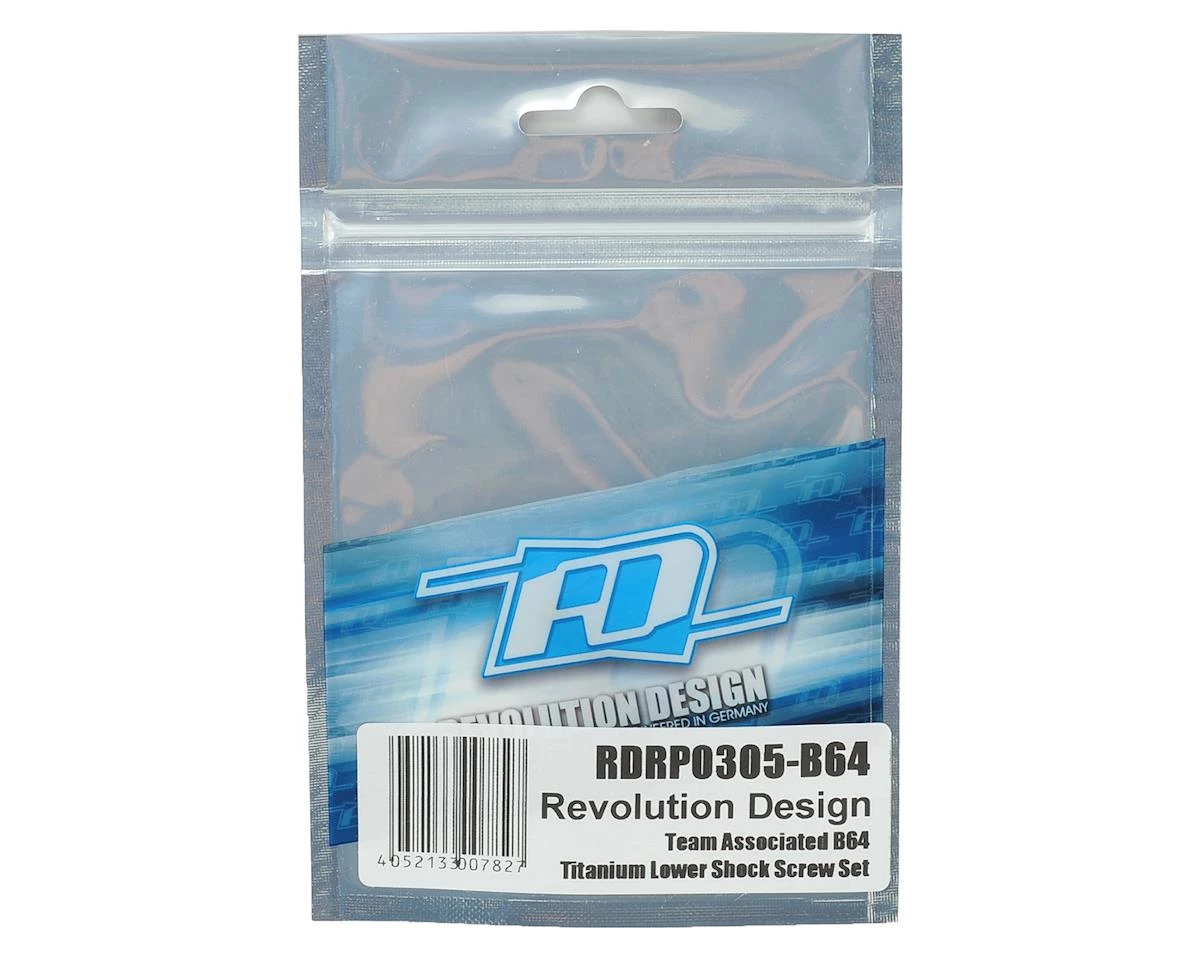 This is an optional Revolution Design B64 Titanium Lower Shock Screw Set. This set includes four screws total; two front and two rear. These screws can be used with a 2mm hex driver or a 5.5mm nut driver.