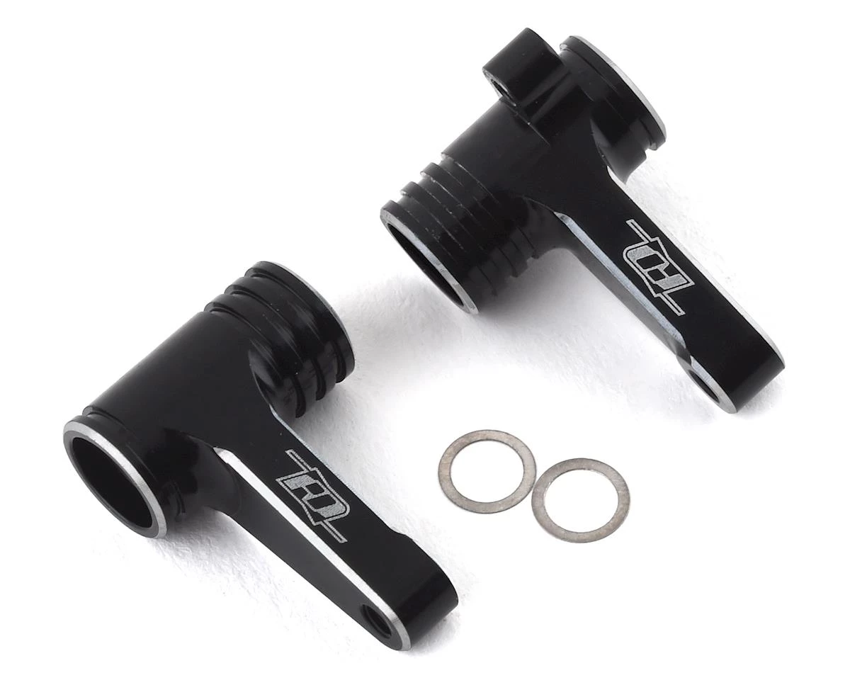 The RDRP B74 Aluminum Bellcrank Set is a direct replacement for the standard composite parts. Machined from aircraft-grade 7075-T6 aluminum and black anodized with chamfered silver edges, these bellcranks add much needed precision to the steering system while also greatly improving overall durability. The increased overall rigidity will also help with steering feel, enhancing steering in high-bite track conditions such as carpet and astro turf.