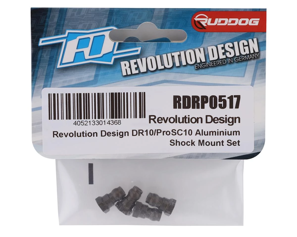 The RDRP DR10/ProSC10 Aluminium Shock Mount Set is machined from aircraft-grade 7075-T6 aluminum and hard-anodised for improved strength and aesthetics. The bushings not only look cool, but they also improve suspension efficiency as they do not bend under heavy loads like the stock bushings do. Precision manufacturing ensures an optimized fit within in the upper shock cap, while the specially treated surface makes for hard-wearing characteristics. Package includes four shock mount bushings.Â