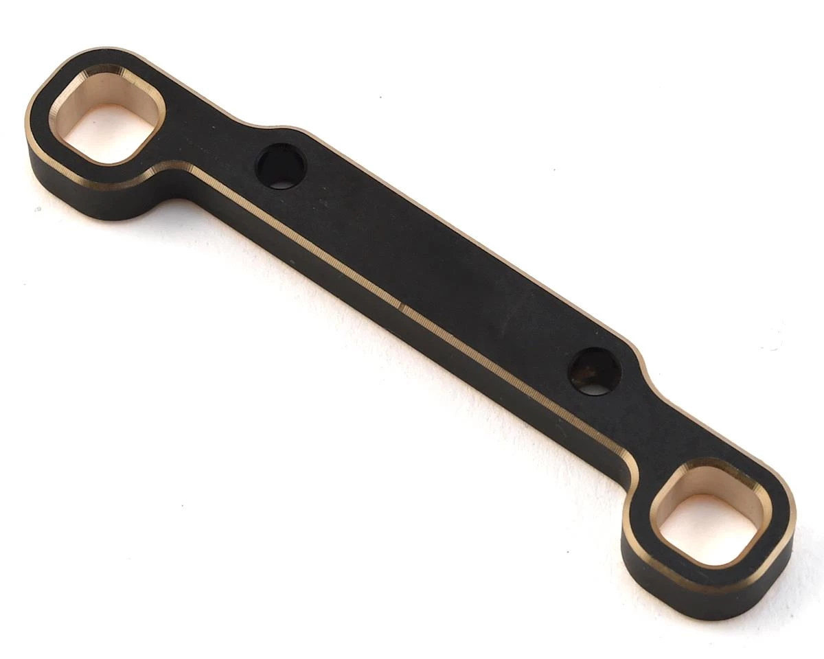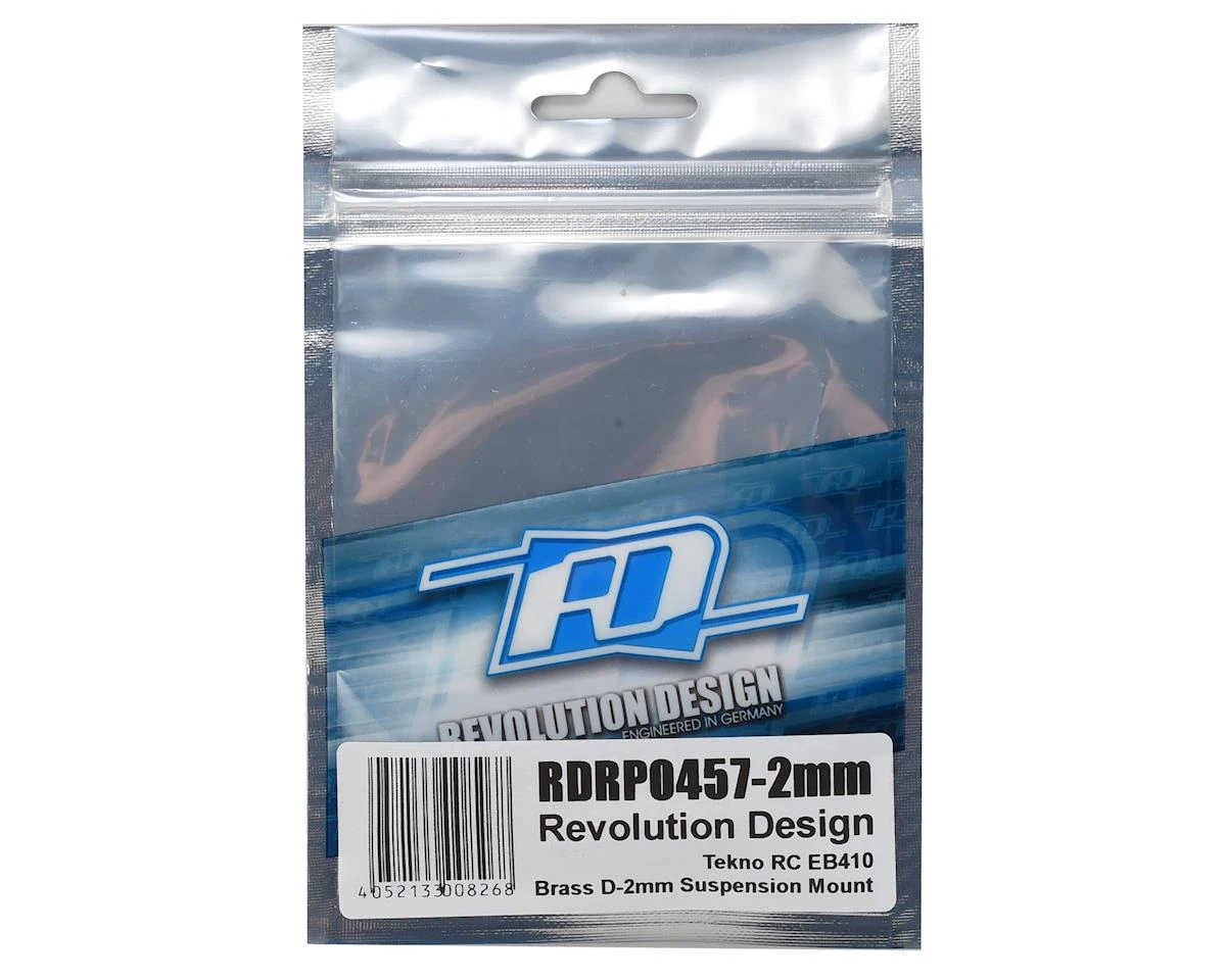 The optional RDRP Brass D-2mm Suspension Mount for the Tekno RC 410 buggy is used when adding the 2mm gearbox shims under the rear bulkhead in order to bring the suspension geometry (and thus roll center settings) back to standard when also utilising the RDRP0452-2mm EB410 Carbon Fibre Shock Tower Rear -2mm. The suspension block adds valuable weight especially when running in low-traction conditions or when the track is getting bumpier. Machined from black-coated brass and sporting gold-colour chamfered edges the part weighs in at 15g which shifts the weight bias further to the rear which helps with rotation into corners especially in low traction conditions while improving overall traction at the same time.