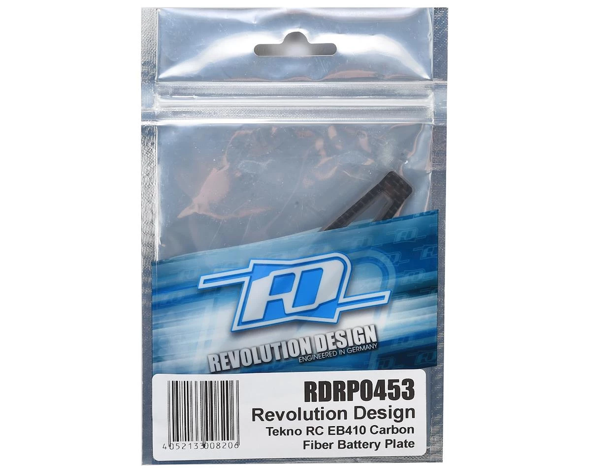 The Revolution Design Racing Products Carbon Fiber Battery Plate for the Tekno EB410 1/10th 4WD buggy does away with the somewhat bulky and unsightly standard plastic part. While improving the overall looks of the buggy the lightweight carbon fiber part will also save a good amount of weight, which results in a lower center of gravity and thus less body roll during cornering and hence higher overall speeds. The battery plate is a direct replacement, designed to work with the standard hardware and machined from high-quality carbon fiber.