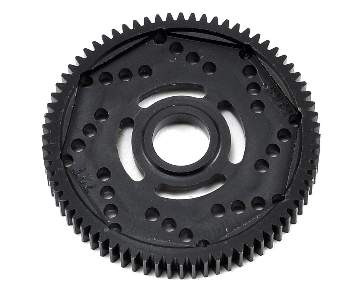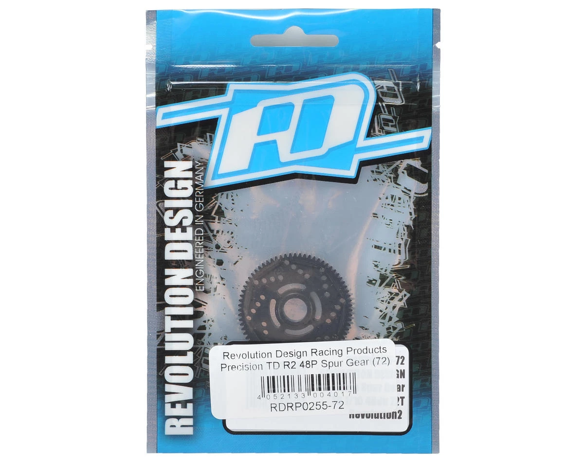 This is the Revolution Design Racing Products Precision TD R2 48 Pitch Spur Gear. The Precision TD R2 Spur Gear was developed specifically for Team Durango’s line of 1/10th scale vehicles. The R2 Spurs are wider than the first generation spur gears, and have been precision machined from RDRP’s specially formulated composite material to delvier incredible strength, low running noise and reliability. The increased gear tooth contact patch improves durability and does not sacrifice efficiency. The precision machining not only increases the durability of the gears, but also helps when setting gear mesh. The gears also feature machined venting and weight reducing holes to minimize heat build-up when running a soft slipper setting. The gears are available in 72, 78, 83 and 87 tooth count options, and are marked with the tooth count for easy identification.