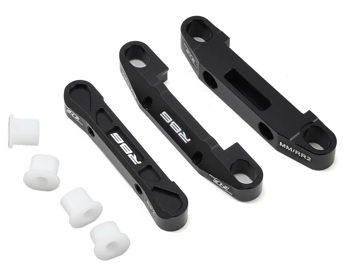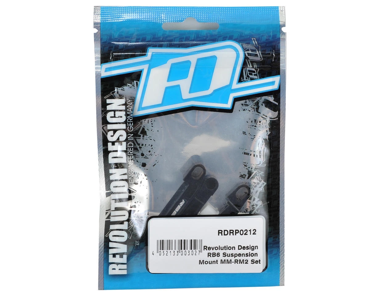 This is an optional Revolution Design Racing Products RB6 MM-RM2 Suspension Mount Set. The RDRP MM-RM2 Suspension Mount Set allows you to change the rear toe-in setting of your RB6 buggy and RT6 stadium truck within seconds. The CNC-machined and black anodized aluminum suspension mounts replace the stock plastic mounts with more durable, highly adjustable components. The front RF2 mount mimics the stock geometry, while the rear RR2 mount uses delrin inserts that provide 2 degree, 3 degree or 4 degree toe-in settings depending on the orientation. This allows the user to tune the rear traction and side bite on the car to suit a variety of track conditions. Plus the kit includes individual RR mounts for rear motor and mid motor applications!