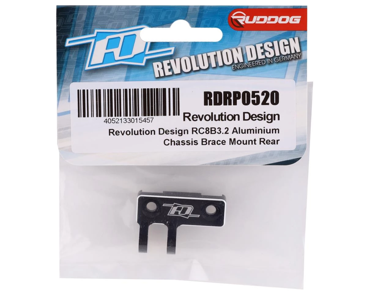 Revolution Designs RC8B3.2/RC8B3.2e Aluminum Rear Chassis Brace. This optional brace is intended to strengthen the rear end of the Team Associated RC8B3.2 or the RC8B3.2e. Package includes one rear chassis brace.