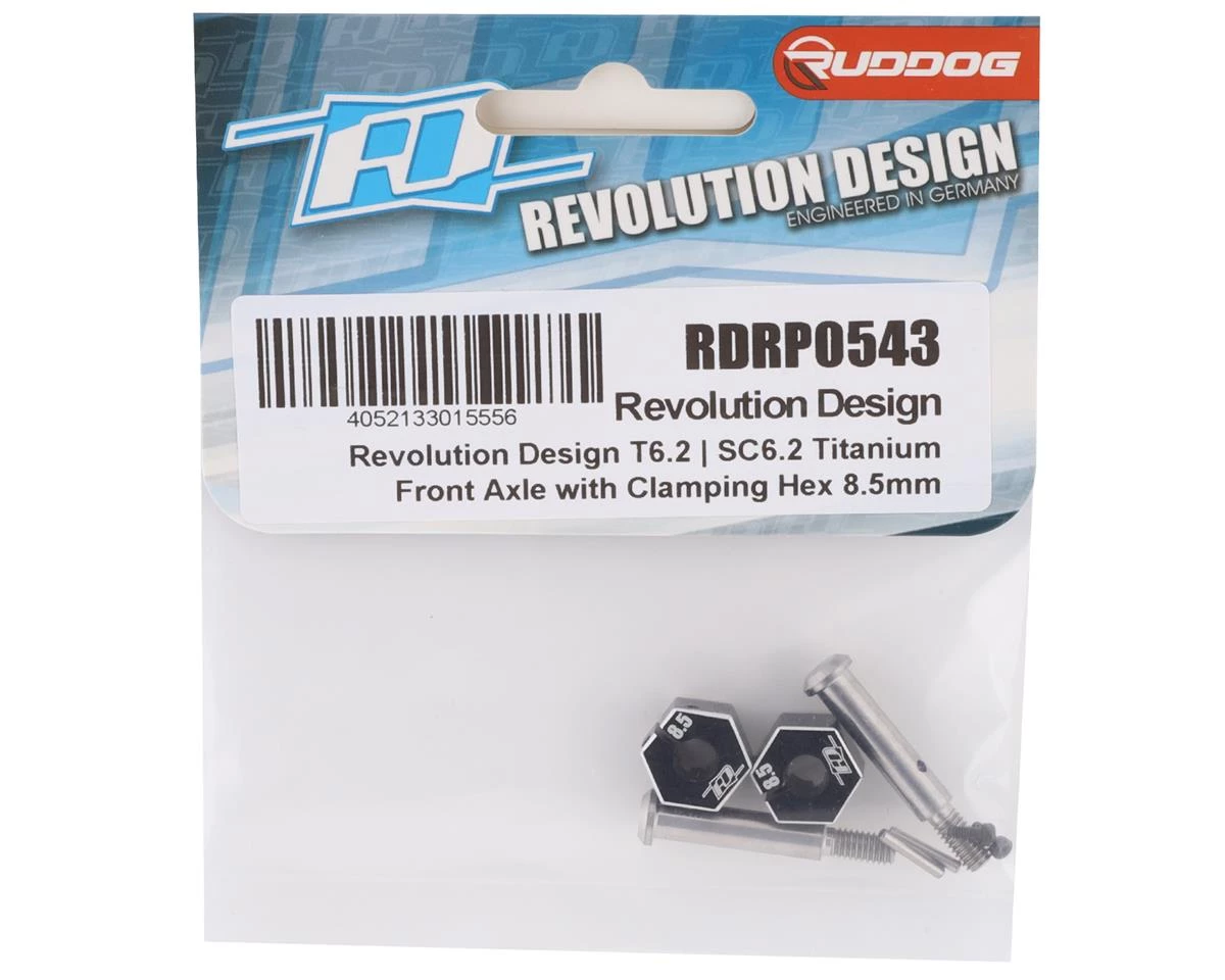 The Revolution Design T6.2/SC6.2 Titanium Front Axle with 8.5mm Clamping Hex system saves weight, adds durability, and increases adjustment options on Team Associated T6.1/T6.2/SC6.1/SC6.2 series models. The one-piece aluminum front axles of Team Associated’s T6.2 and SC6.2 are made of steel for added durability, but still have a fixed track width and off-set, and increase unsprung weight. RDRP’s titanium wheel axles come with 8.5mm aluminum clamping hexes and are fully compatible with Associated 1/10th scale wheel hexes to allow use the full range of track with tuning options.