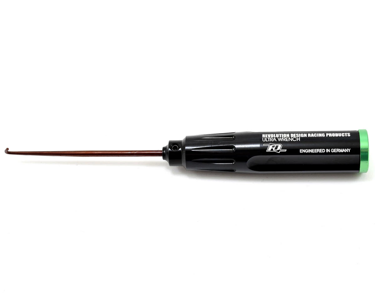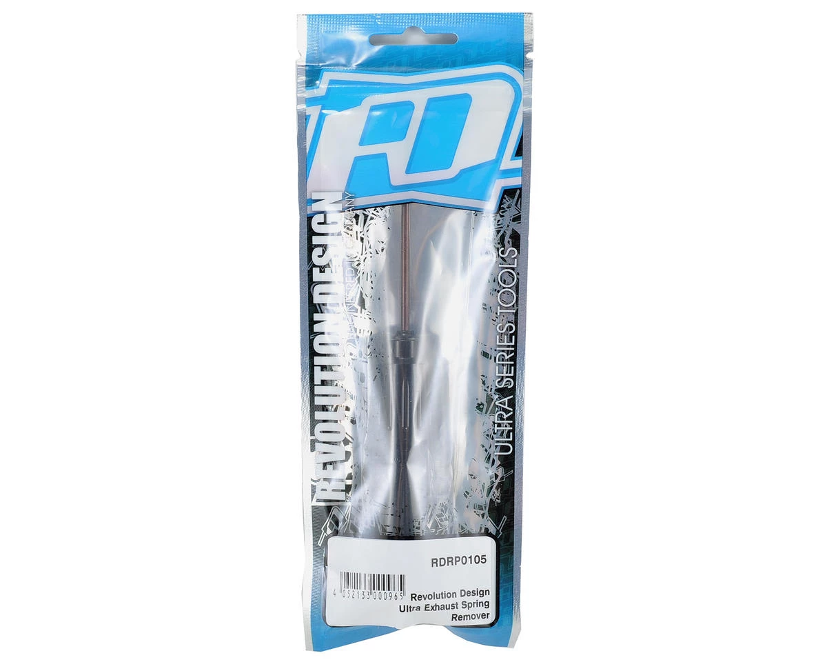 This is the Revolution Design Racing Products Ultra Exhaust Spring Remover. The Ultra Exhaust Spring Remover was developed to provide a tool that makes it easy, convenient and safe when working with exhaust springs. Like the ones used to hold the muffler in place. The tool comes in handy when building an exhaust system or when coupling them to the engine crank case, and also helps to remove installed springs. The Ultra Exhaust Spring Remover features a black anodized CNC-machined 7075-T6 handle and a high quality hardened spring steel tool tip. A colored cap makes identification in your tool bag easy.