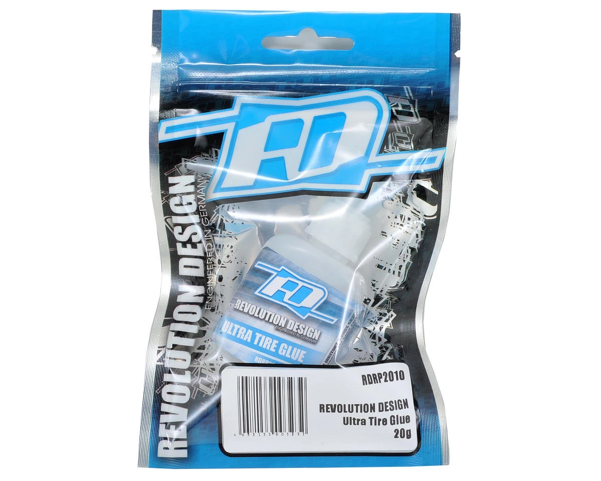 This is a 20 gram bottle of Revolution Design Racing Products Ultra Tire Glue. RDRP Ultra Tire Glue is a specially formulated CA cement that is ideal for rubber on-road and off-road tires as the low viscosity allows the adhesive to fill even the smallest of gaps for a strong and reliable bond. The glue comes in handy 20g bottles with a fine tip for easy application while the needle-equipped cap keeps the tip free from glue build up during long term storage and transportation.